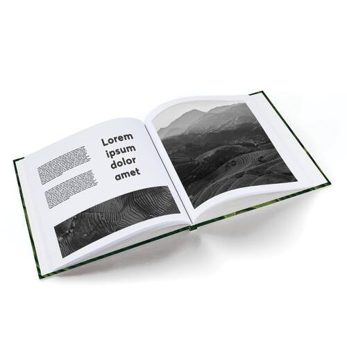 - Livre à couverture rigide en format portrait avec dos carré et coins pointus