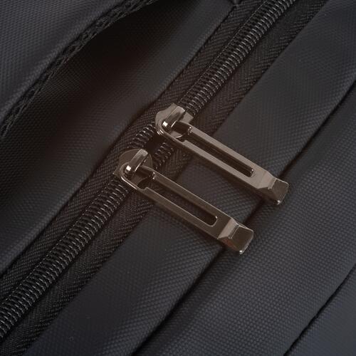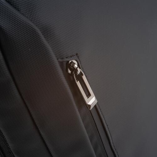 - Il dispose de deux compartiments avant zippés, d'un grand compartiment principal avec rembourrage pour l'ordinateur portable, de diverses poches intérieures, de bretelles rembourrées, d'une poignée de transport et d'une sangle à l'arrière pour le fixer à un trolley